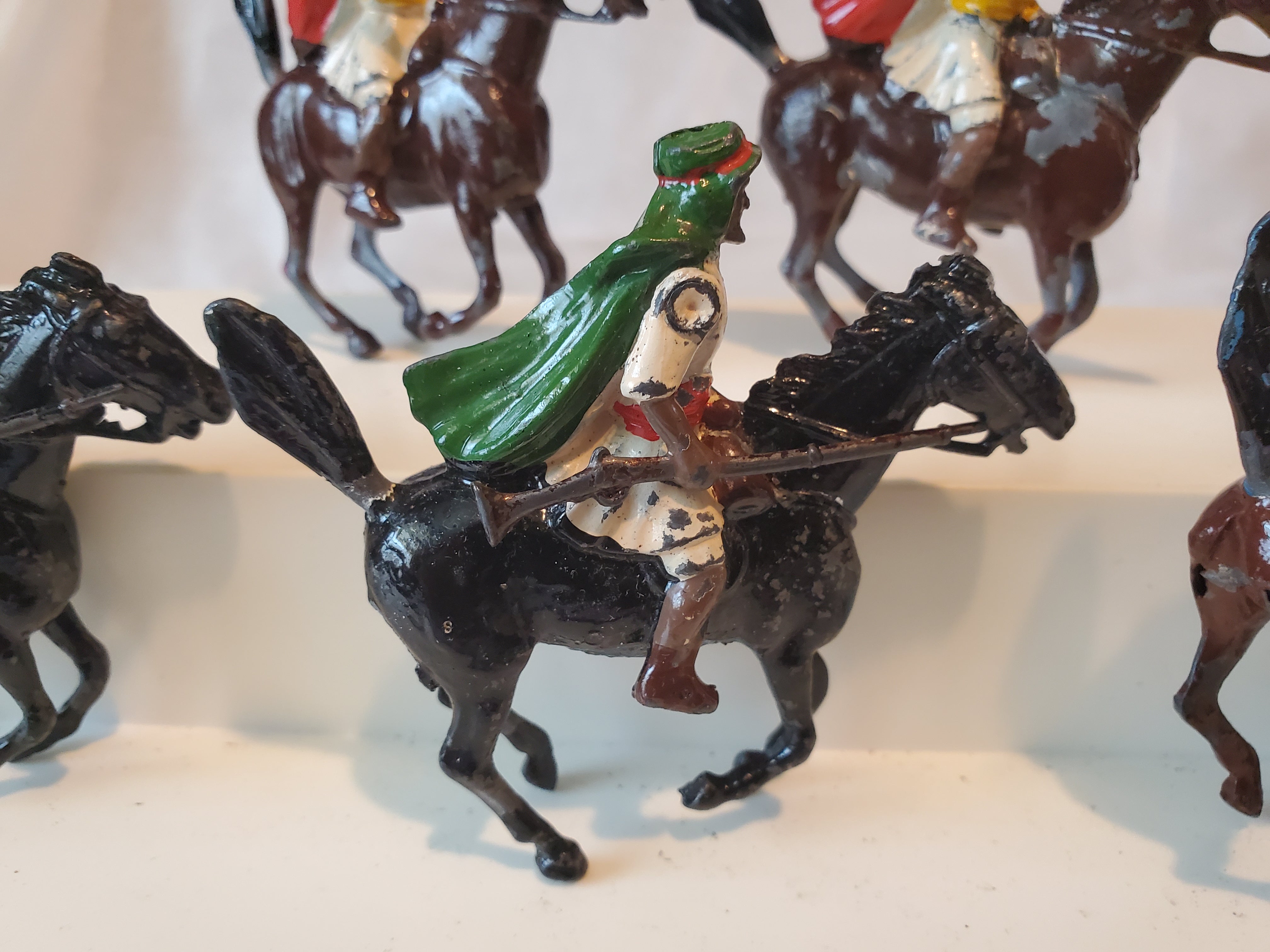 This is a Pre-war set of lead Britains Arabs of the Desert #164, mounted on horses. Made in United Kingdom. Condition is pretty good with some paint missing and one glued leg on a horse. Please see photos..